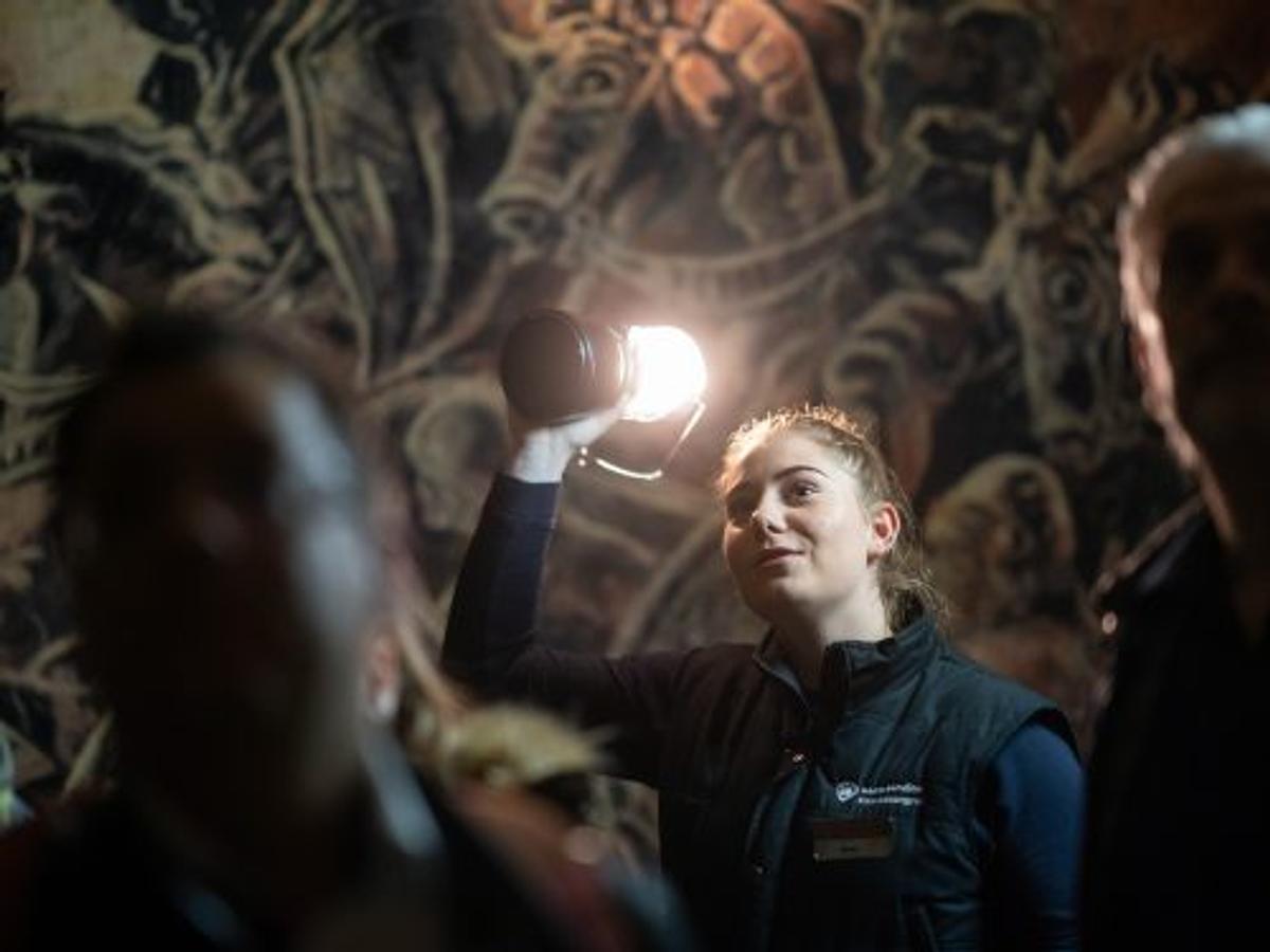 De Fluweelengrot herbergt tal van geheimen en een schat aan indrukwekkende wandschilderingen, inscripties, vreemde sculpturen in de zachte mergelwand en een romantische kapel daterend uit de Franse tijd (18e eeuw).